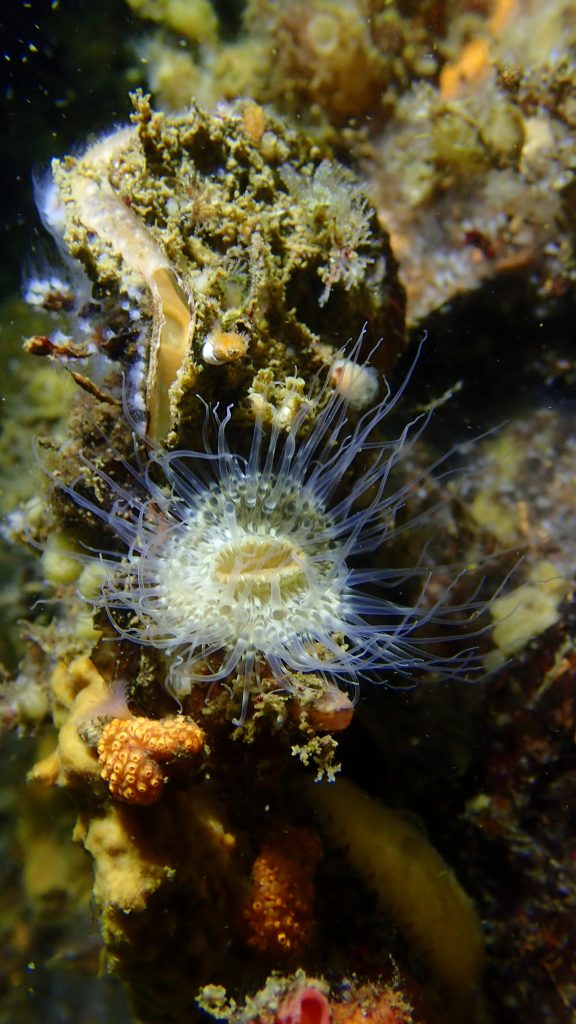 En pleine canicule, avec une eau à 24°C, cette troisième plongée a permis aux plongeurs d’observer une faune fixée très présente sur les quais, ainsi que des petites seiches et ophiures sur les fonds vaseux.